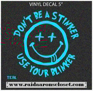 Don't Be A Stinker, Use Your Blinker!! Support safe driving with this cool white vinyl decal. Proudly made in Fort Pierce, Florida by Aaron's Custom Prints. Available in 5 cool colors and 3 different faces!! This is the stinky face.